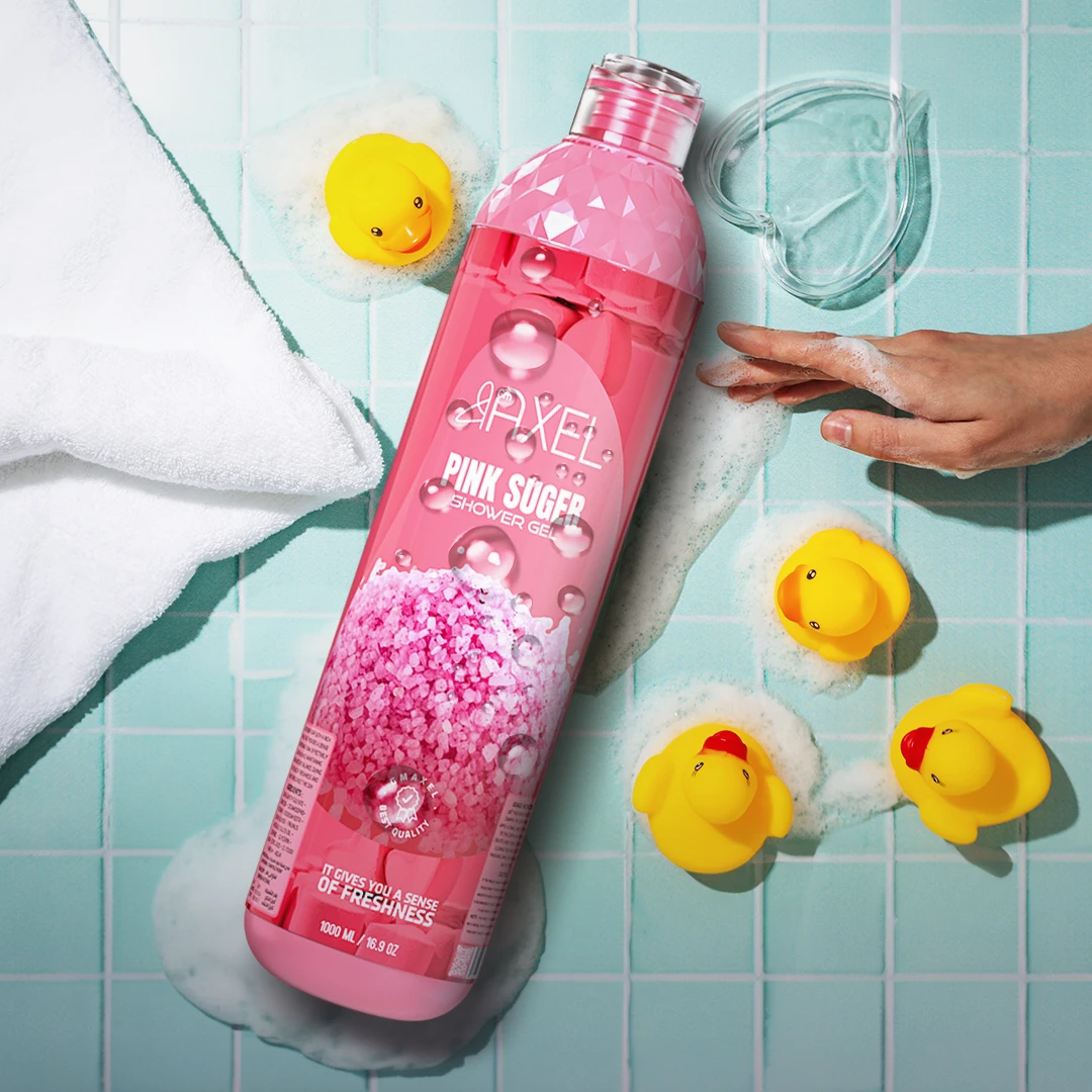 شاور جل بينك شوجر من GM Axel ينظف الجسم بعمق ويرطب البشرة مع رائحة حلوة مشرقة تدوم, رغوة غنية وحجم 1000 مل